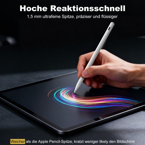 Neigungssensor & präzise Steuerung: Passt die Strichstärke automatisch an, für ausdrucksstarkes Zeichnen und Schreiben. Das 1,5-mm-Pen tip gewährleistet präzises Schreiben und überlegene Reaktionsgeschwindigkeit. *Dieser Stylus Pen für Ipad unterstützt keine Druckempfindlichkeit
